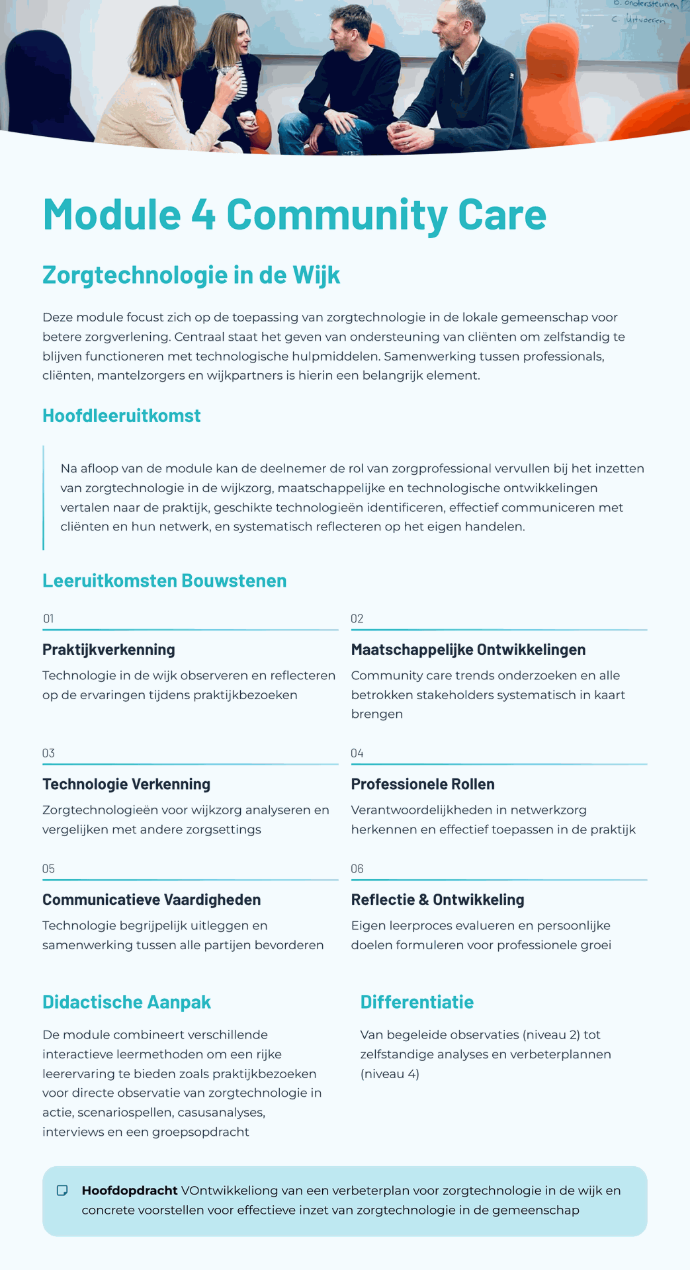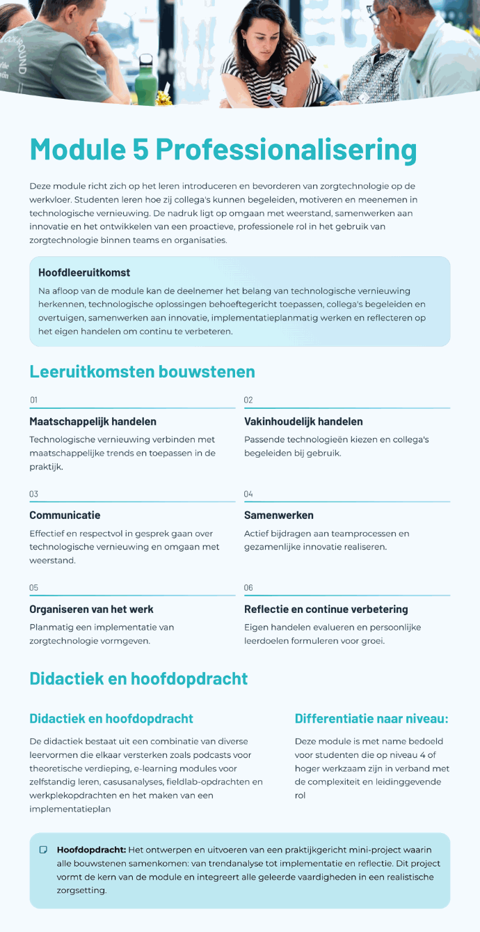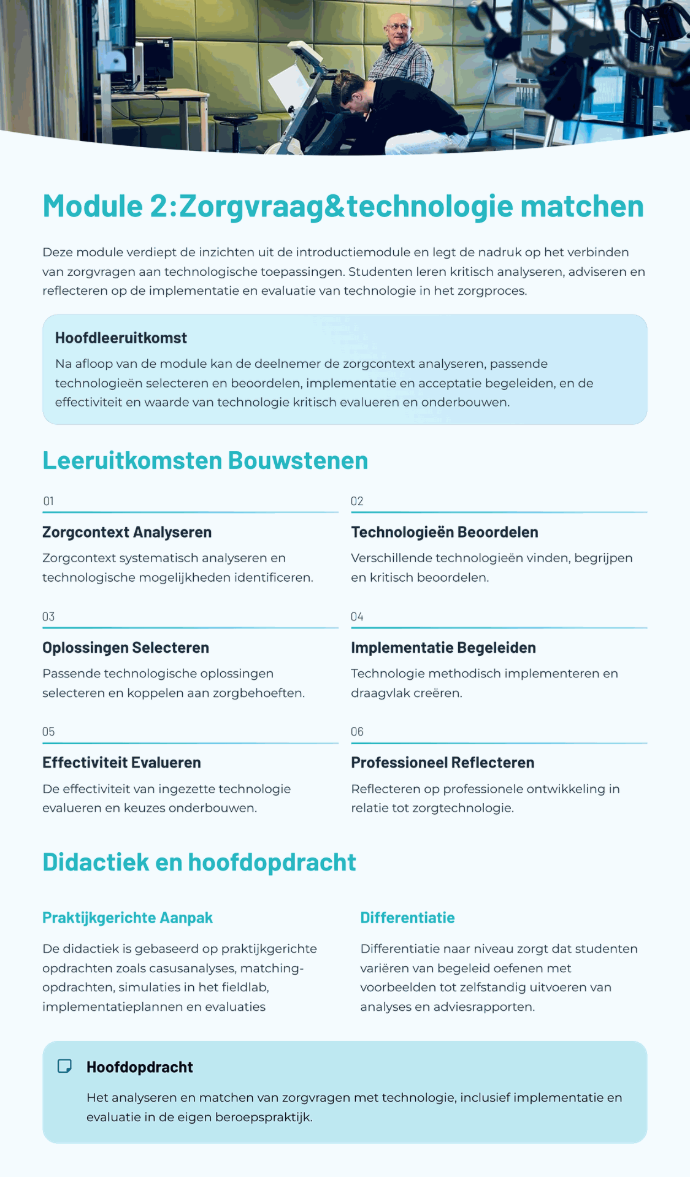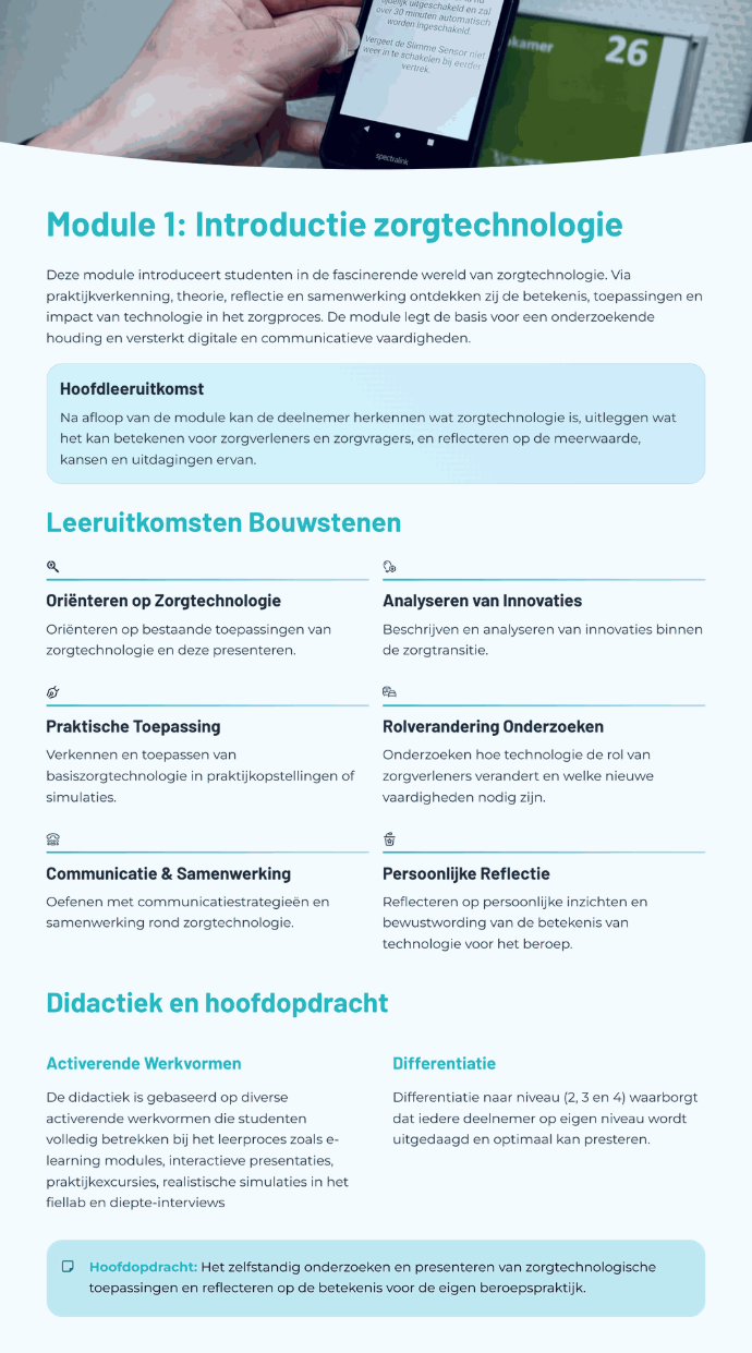 Deze OnderwijsOntwerper helpt docenten, begeleiders of (zorg)professionals bij het ontwikkelen van les- en leermateriaal voor iedere context en op ieder niveau. Deze tool ondersteunt bij het uitwerken van opdrachten, het vormgeven van praktijkgerichte leersituaties en het beantwoorden van inhoudelijke vragen over zorgtechnologie.